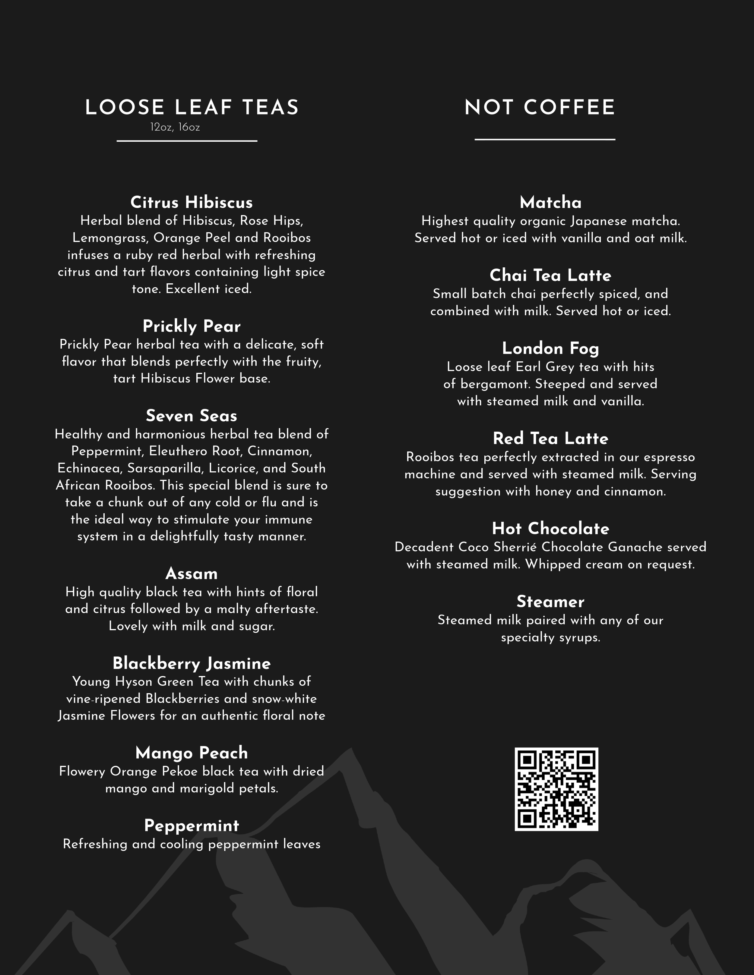 Come in and enjoy our micro-roasted specialty espresso drinks, nitro-infused cold brew, small batch chai, premium loose-leaf teas or traditional matcha.